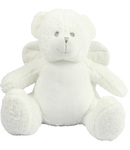 100% polyester. Soft plush white bear. Contrast eyes and nose. Fabric wings. Removable inner pad. Zip access for decoration onto front panel. Suitable for embroidery, print and sublimation.