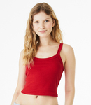 90% airlume combed ringspun cotton/10% polyester. Pre-shrunk. 1x1 micro rib. Thick spaghetti straps. Side seams. Cropped length. Tear out label.
