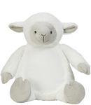 100% polyester. Soft plush cream lamb. Contrast face, hands and feet. Sewn eyes and mouth. White coloured panel on tummy. Removable inner pad. Zip access for decoration onto front panel. Suitable for embroidery, print and sublimation.